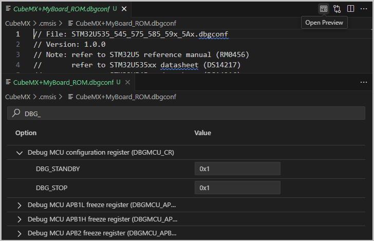 Many configuration files have annotations for the CMSIS Configuration Wizard. Using the Open Preview button in the editor allows you to modify options in a graphical view.