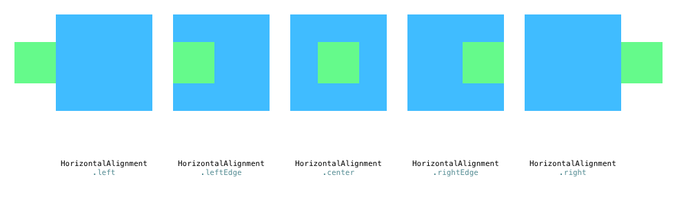 public enum HorizontalAlign { case left // Align horizontally to the Left case leftEdge // Align horizontally to the Left Edge case center // Align center.y horizontally case rightEdge // Align horizontally to the Right Edge case right // Align horizontally to the Right }The vertical options align the calling view on the vertical plane, with illustrations below