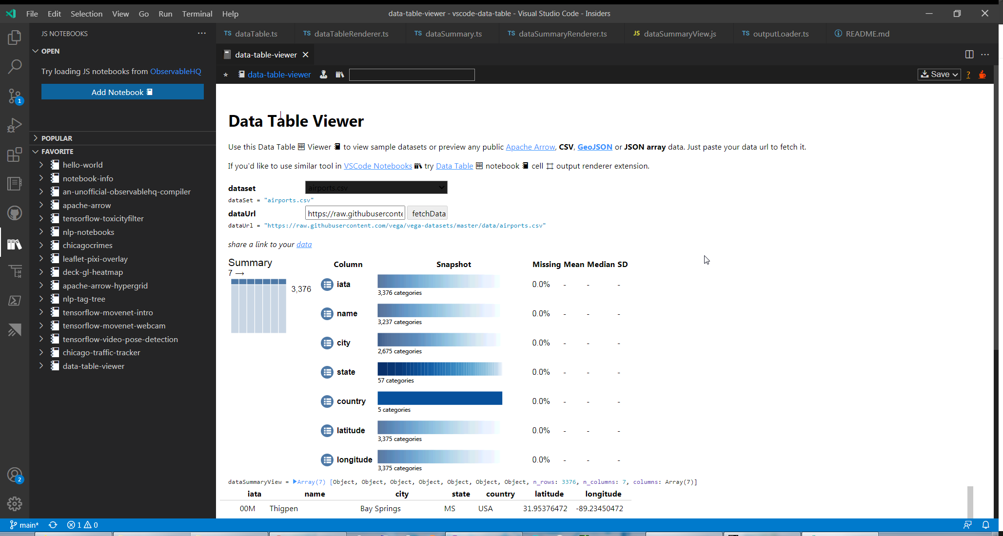 This general purpose Data Table πΈ Renderer extension also includes Data Summary π Renderer based on modifield Observable Summary Table component for a quick overview of datasets loaded in VSCode Notebooks π