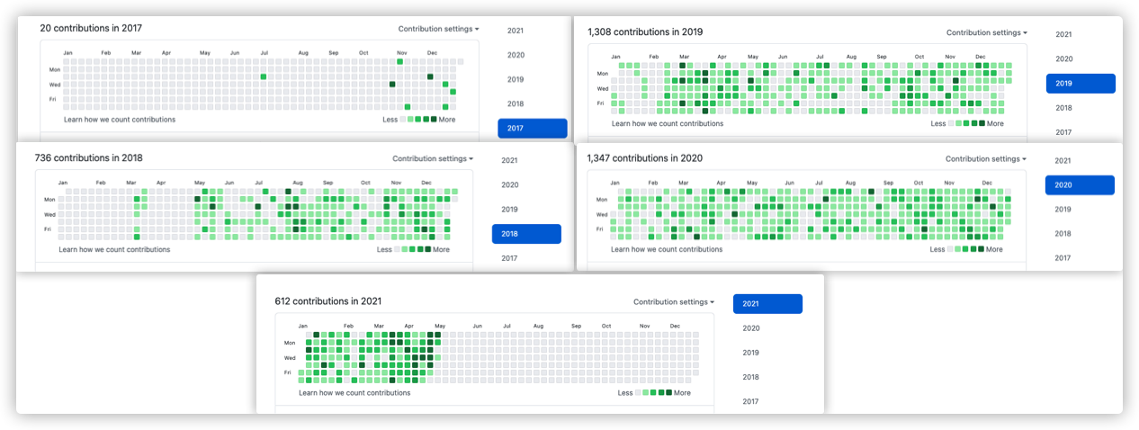 。下图是我的 2017~2021 的 Github 提交记录。