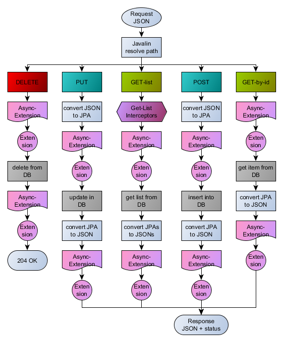 Further it has interceptors and extensions allowing you to interact with the process of generating a response for a specific request at any level. The sync-extensions may abort the standard-process at any point or simply alter the DTOs passed.