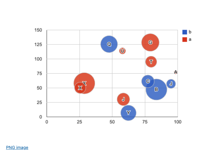 my @res2 = [('A'..'Z').pick, 120.rand, 130.rand, <a b>.pick, 10.rand] xx 12; @res2 = @res2.map({ <label x y group z>.Array Z=> $_.Array })».Hash; js-google-charts('Bubble', @res2, column-names => <label x y group z>, format => 'html', :png-button, div-id => 'bubble');