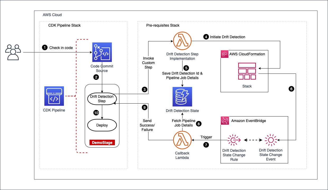 Drift detection step is defined in src/pipelines/drift-detect-step.ts; where in it uses a lambda function (already deployed via pre-requisite stack) as an implementation provider. If stack is in the drifted status, then a failure is sent back to the pipeline; else a success is sent so that the pipeline can continue.