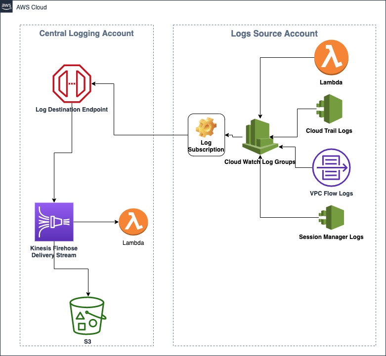 This solution mainly involves Amazon Kinesis Data Firehose which provides the ability to process data in real-time allowing critical use cases to be implemented based on it. The centralized logging account will expose a Log Destination endpoint which in turn is connected to a Kinesis Firehose. Kinesis Firehose is configured to push data to Amazon S3 Bucket. We could configure a lambda to un-compress/format the data before it is sent to S3. Also we can utilize Kinesis Firehose configuration to transform the data using AWS Glue before pushing it. Also, Firehose can not only push the data to S3 but also supports other destinations like Amazon Redshift, Amazon Elasticsearch Service and Splunk.