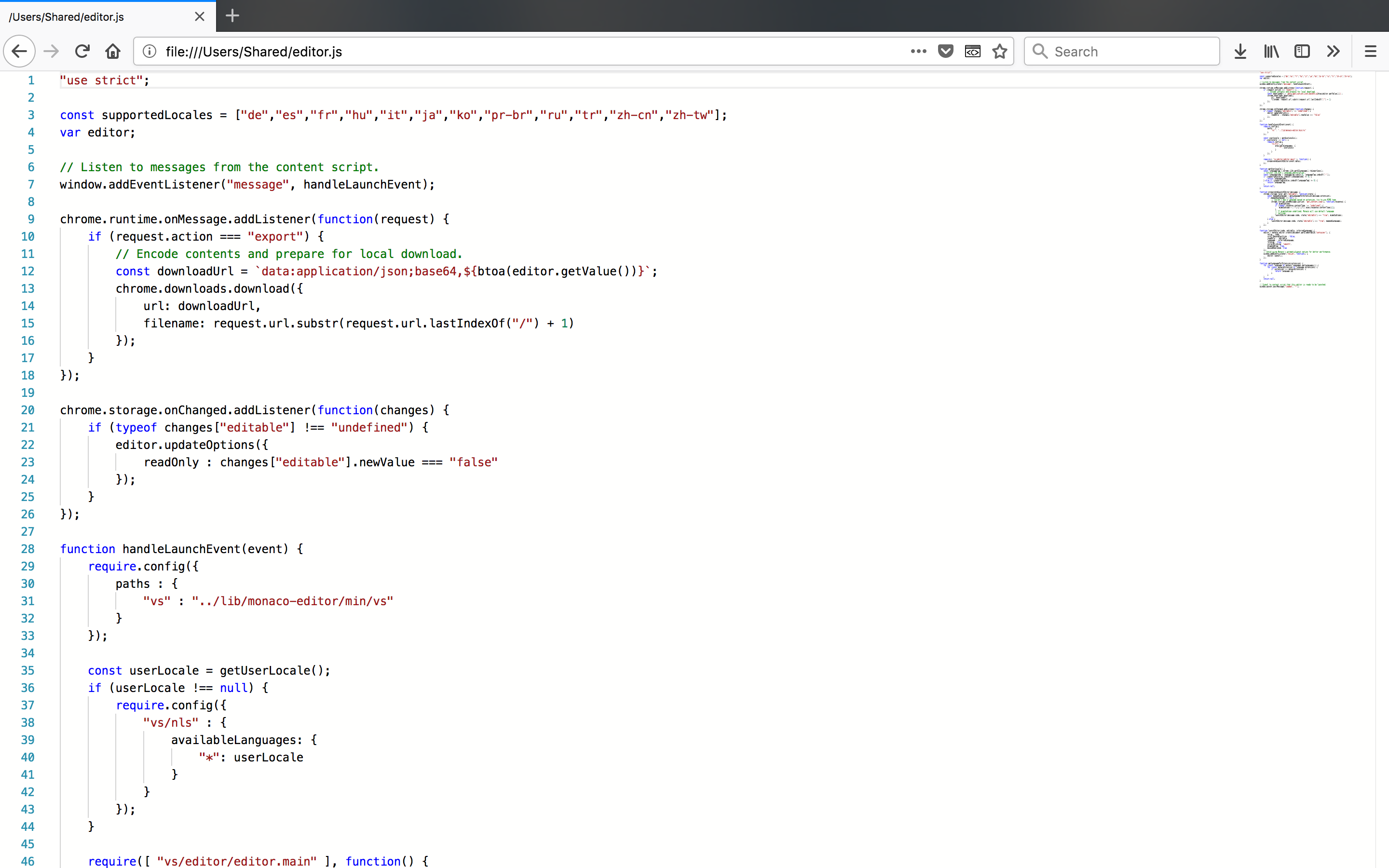 Codext harnesses the power of the Monaco Editor by dynamically inserting it into webpages. The extension targets preformatted text (i.e. pages containing a unique <pre> tag) and determines the programming language to use by looking at the URL's extension and/or the returned Content-Type header. An editor instance is fully configured on the fly and in addition to standard features such as syntax highlighting, section folding and code formatting, Codext allows users to interact with documents and export changes locally.