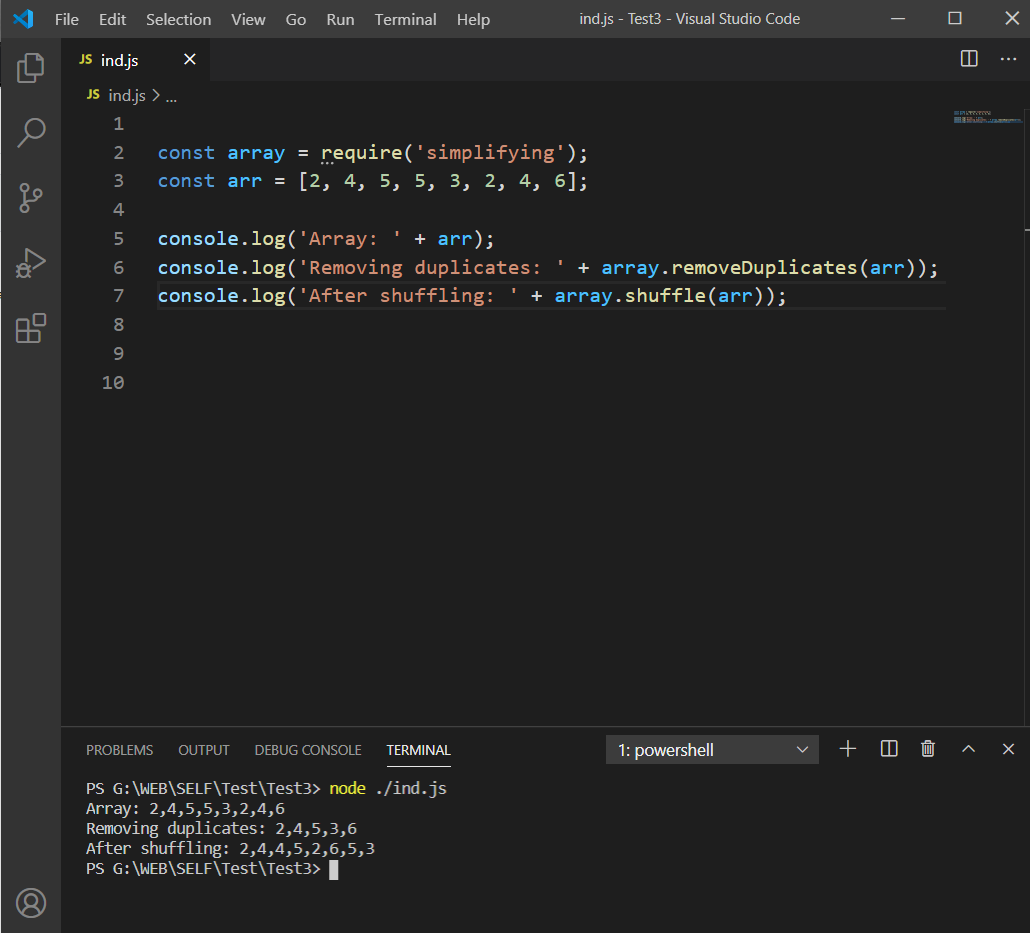 const array = require('simplifying'); let arr = [2, 3, 4, 3, 3, 2, 4]; console.log(array.removeDuplicates(arr)); //OUTPUT: [2, 3, 4]