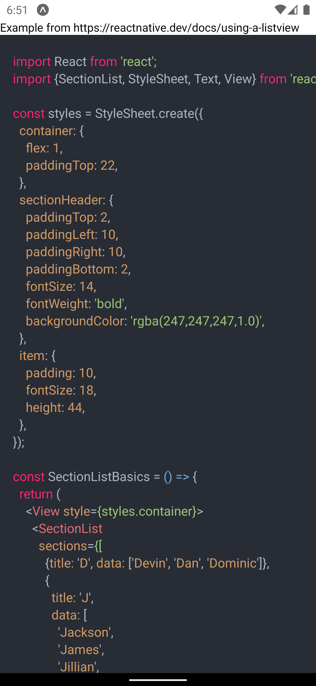import React from "react"; import { StyleSheet } from "react-native"; import CodeHighlighter from "react-native-code-highlighter"; import { atomOneDarkReasonable } from "react-syntax-highlighter/dist/esm/styles/hljs"; const CODE_STR = `var hello = "world"`; export default function HighlightComponent() { return ( <CodeHighlighter hljsStyle={atomOneDarkReasonable} containerStyle={styles.codeContainer} textStyle={styles.text} language="typescript" > {CODE_STR} </CodeHighlighter> ); } const styles = StyleSheet.create({ codeContainer: { padding: 16, minWidth: "100%", }, text: { fontSize: 16, }, });