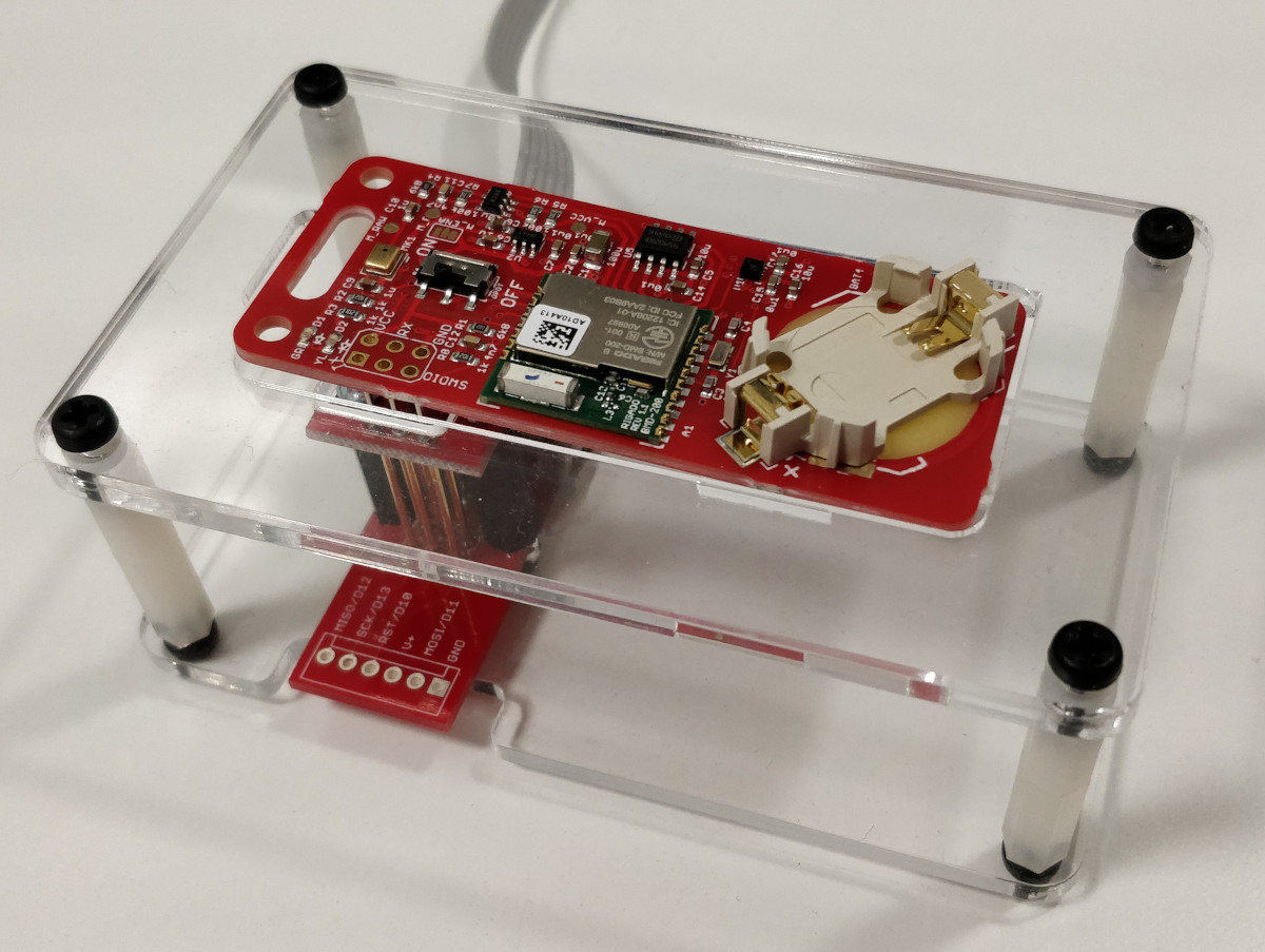 In this option, we create a small rig where you can place the badge and press it down against pogo pins. It makes it easier when you need to program large batches of badges. Note that we use the same pogo programmer kit from SparkFun, but assemble it in a different way so it fits in the rig.