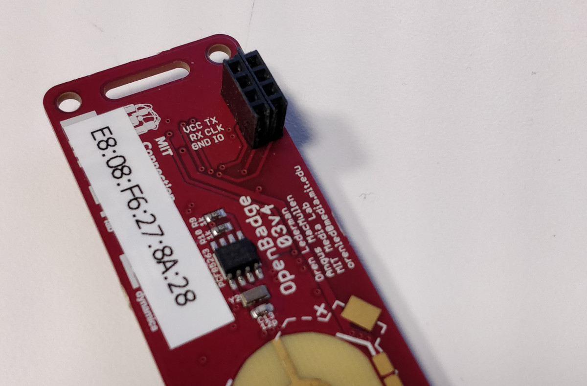 Once ready, place the programmer on the top side of the badge, and make sure you align the pins correctly (use VCC and GND for guidance).