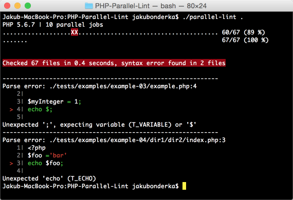 This application checks the syntax of PHP files in parallel. It can output in plain text, colored text, json and checksyntax formats. Additionally blame can be used to show commits that introduced the breakage.