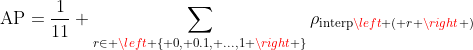 The 11-point interpolation tries to summarize the shape of the Precision x Recall curve by averaging the precision at a set of eleven equally spaced recall levels [0, 0.1, 0.2, ... , 1]: