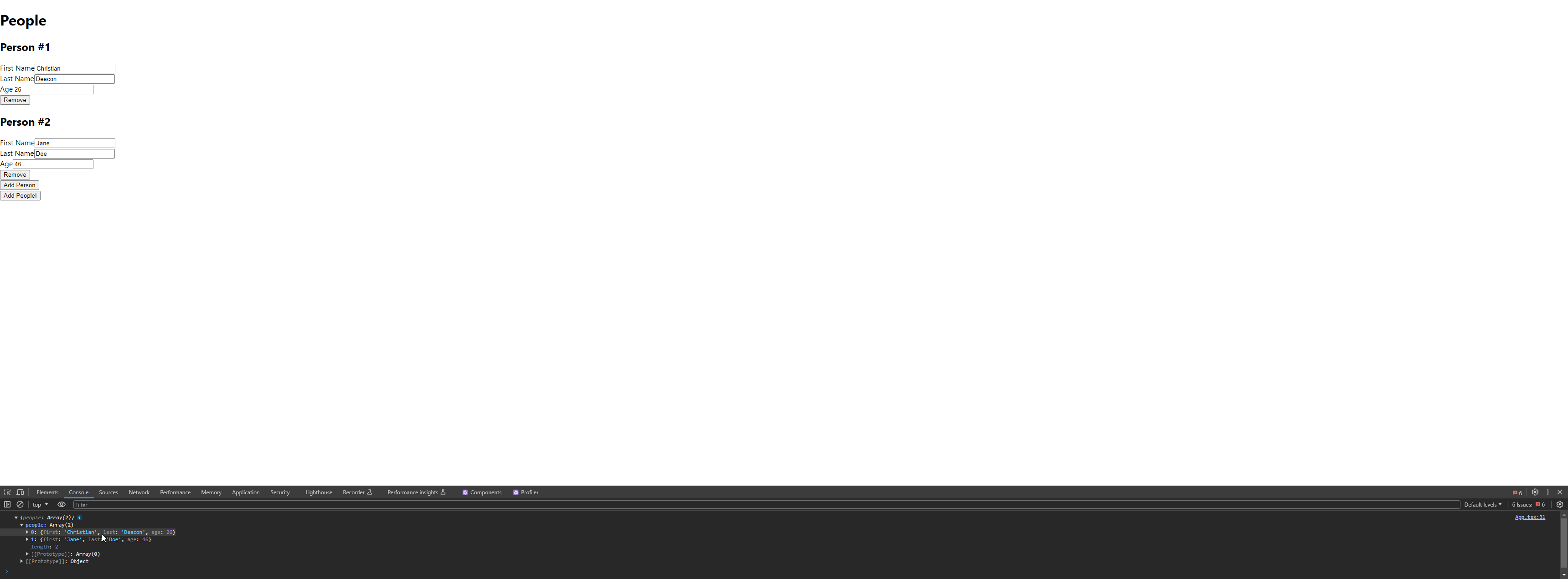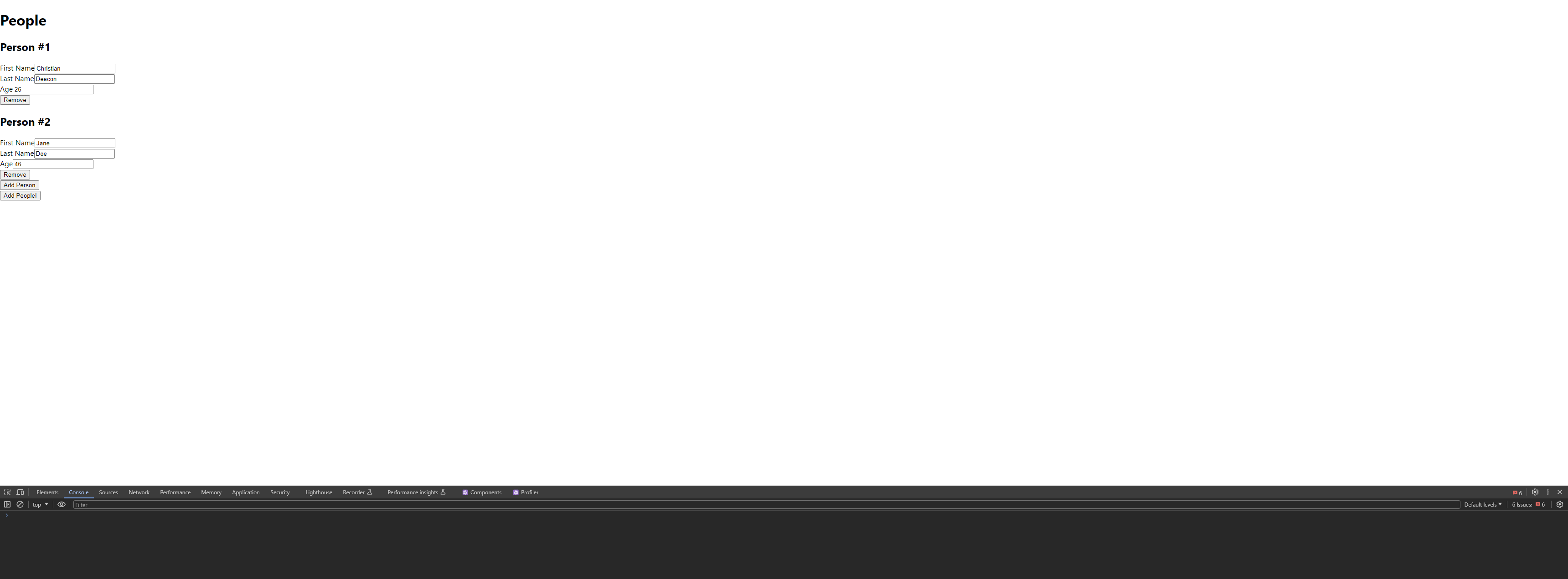 The form in this guide will represent a list of people. Each person will have first name, last name, and age fields. You will be able to add another person to the list by clicking the Add Person button and remove a specific person by clicking the Remove button underneath the list of fields for that specific person.