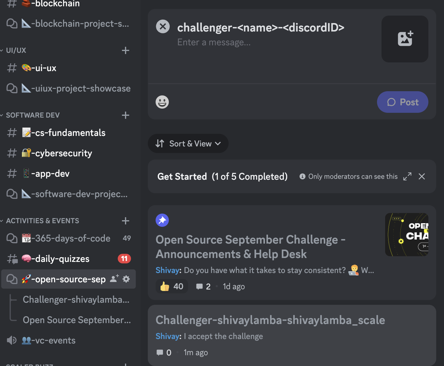 Create a new forum post in the forum channel ##open-source-sep with the title as - challenger-<yourname>-<DiscordUsername>