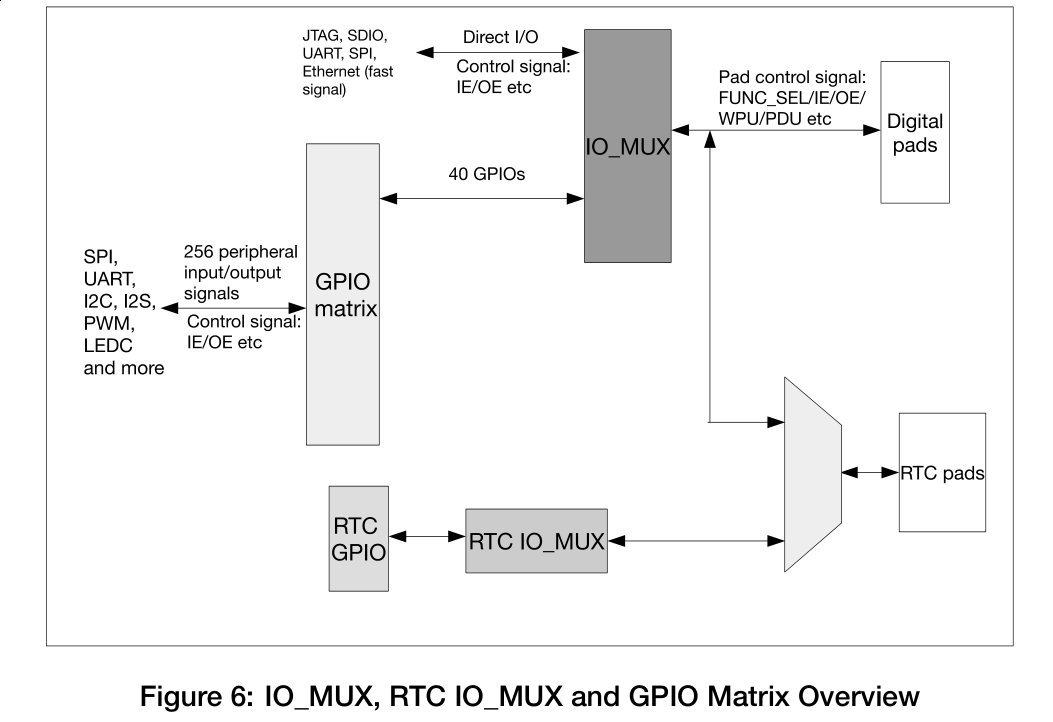 The I/O section is noteworthy. Working our way from the physical pin inward, there’s a multiplexer that allows multiple functions to share the pin. One of the routing choices may lead to an analog subsection, for instance. Some pins have dedicated hardware peripherals at the I/O MUX stage. The coolest option, though, is “GPIO” which then leads to a matrix that connects any of the digital hardware peripherals to that pin. Want UART2 RX on pin 13? No problem, just set it up in code. This should go a long way to help ease routing and pin-contention conflicts among the peripherals.
