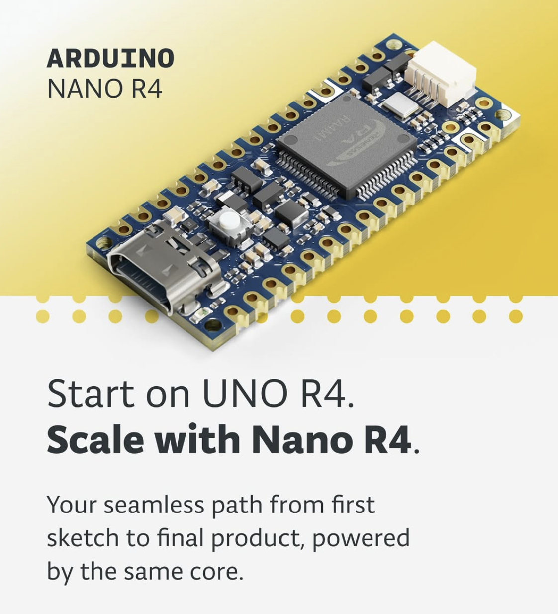 - The 7-segment display is connected to the power supply and I2C (SDA 4 and SCL 5 of the Nano R4).