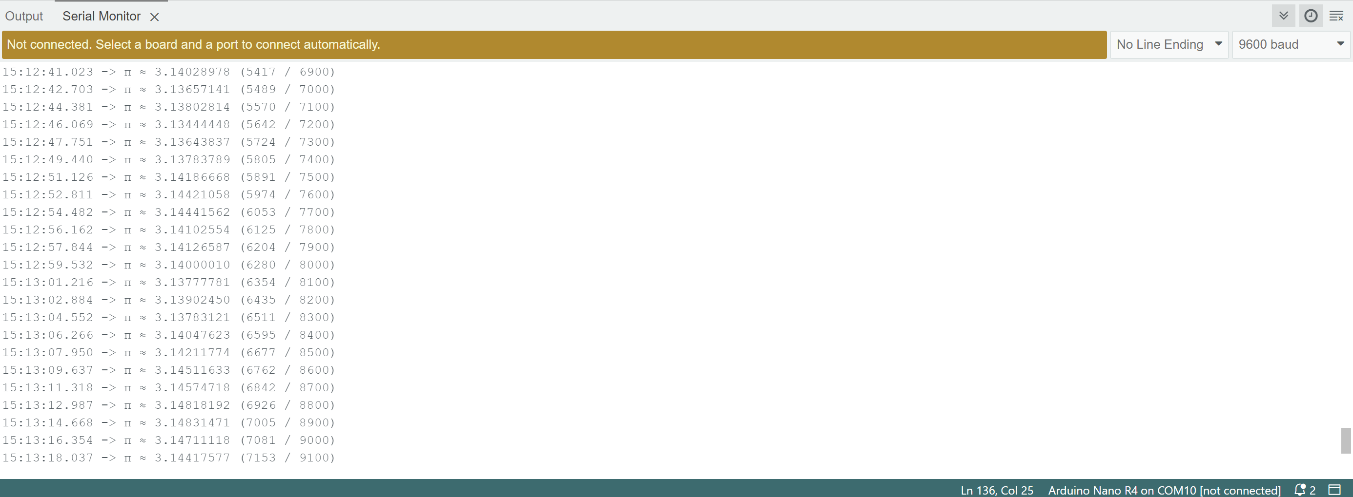 Once per second, 100 new samples are generated for the Monte Carlo simulation. The estimated Pi value is displayed on the serial monitor and also on the 7-segment display, accompanied by a beep and a change in the RGB LED color to indicate a new reading. The display is updated with the new, more precise PI.