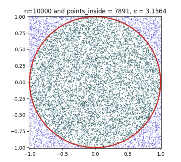 The program simulates the random throwing of darts - one per second -onto a square that goes from (0,0) to (1,1). A dart is considered "inside the circle" if: x² + y² ≤ 1. The proportion of darts inside the circle to the total is an approximation of π/4. Therefore: π ≈ 4 × (darts in the circle / total darts).