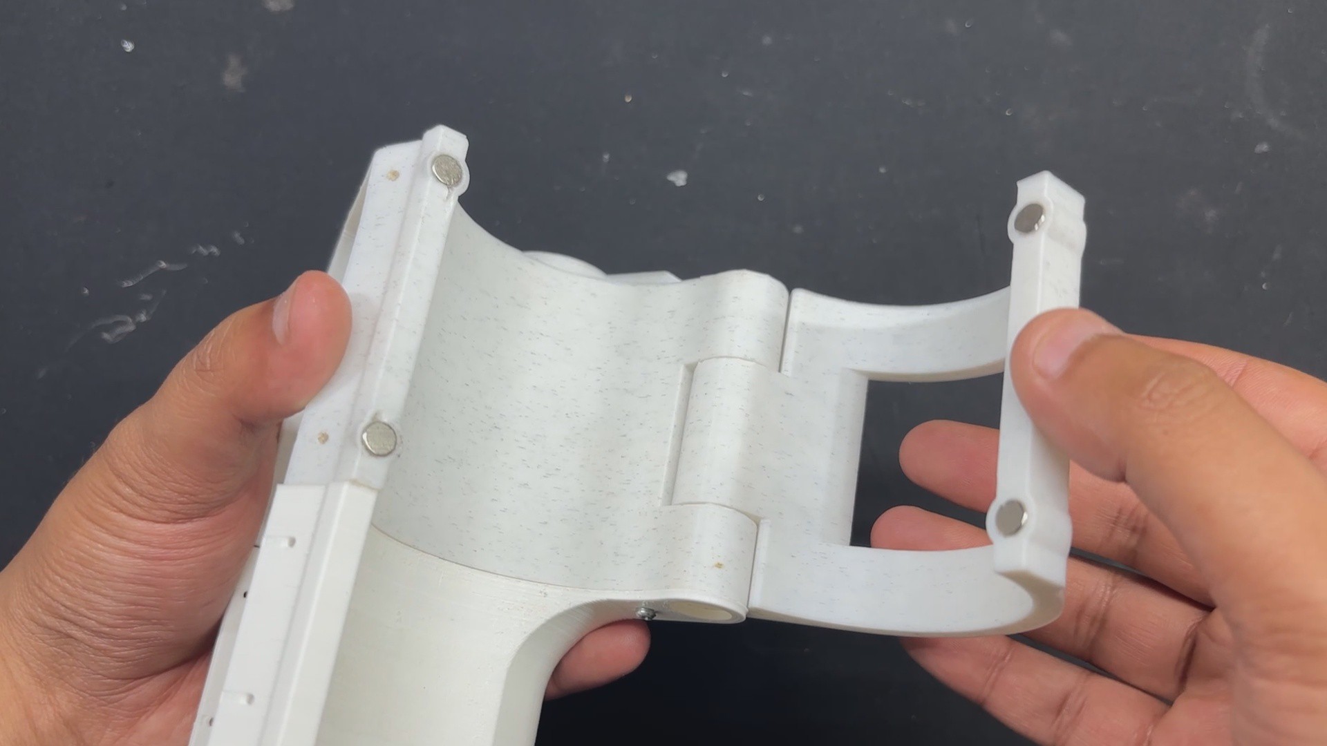 We decide to retain the wrist clamp, which is attached to the main body and pivots on a hinge. In order to keep the hinge clamp part of the watch attached to the body, super magnets are attached to the inside of the clamp and body. The hinge part of the watch is secured in place by these magnets. It can be worn by applying some force to the magnet joints, which will open the clamp and allow the user to put the watch on their wrist.