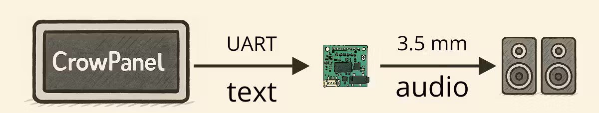 Data flow: CrowPanel (UART) → TinyTTS → Speaker