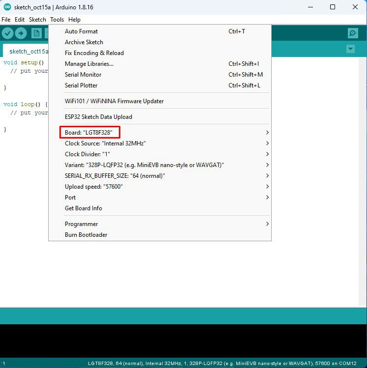 For support in Arduino IDE for LGT8F328P, we need to enter the given link (https://raw.githubusercontent.com/dbuezas/lgt8fx/master/package_lgt8fx_index.json) in File - Preferences - Additional Boards Manager, and then in Tools - Boards Manager we install this microcontroller.