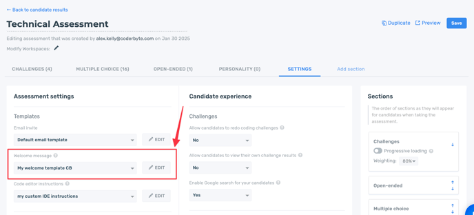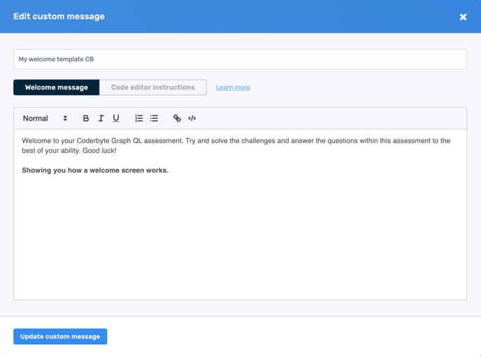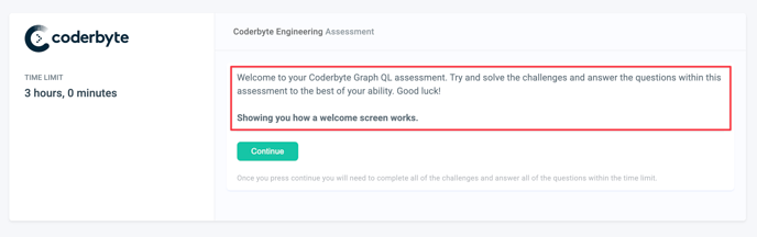 You can pick which welcome message a code screening assessment uses from the screening assessment settings page.