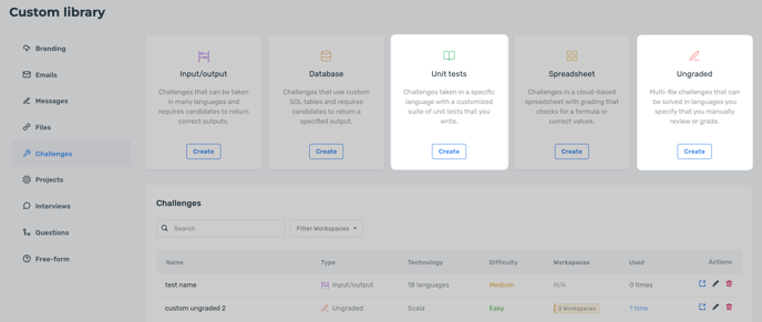 Choose from either Unit tests, which are graded challenges taken in a specific language, or select Ungraded to create challenges that can be solved in languages that you specify.