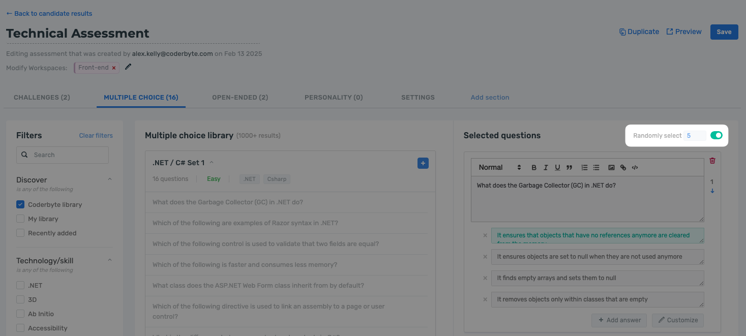 Open the desired Assessment, click Edit, and then navigate to either the question type. You will see an option to enable or disable random selection, with an input for how many questions you'd like each candidate to be shown.