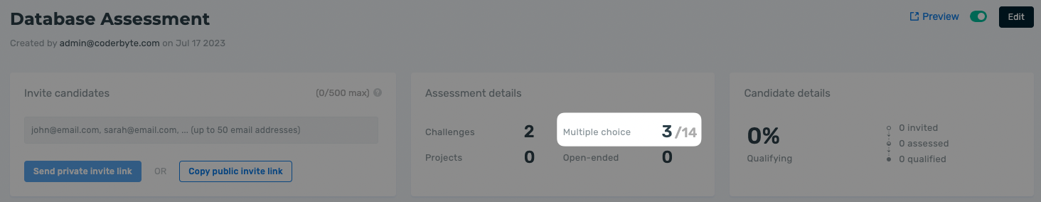 The Assessment overview page will indicate how many questions each candidate is shown from the total selection.