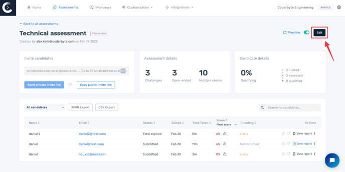 In addition to coding challenges, you can now add spreadsheet challenges to any assessment. Click Edit in the upper right of any existing assessment to modify all the settings, challenges, and questions.