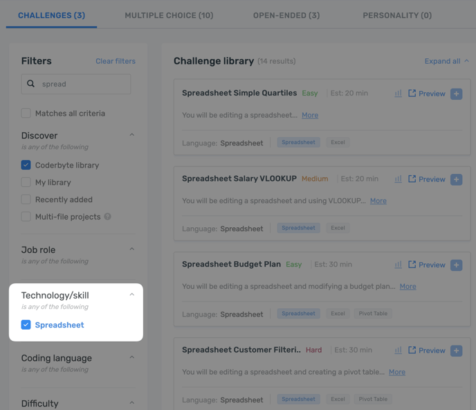 On the first tab, you will see our Challenge Library with a filer on the left-side panel. Search and select Spreadsheet or Excel to view and add challenges.