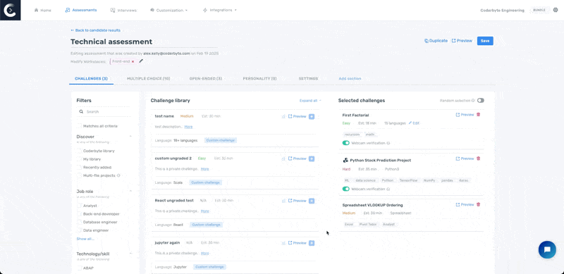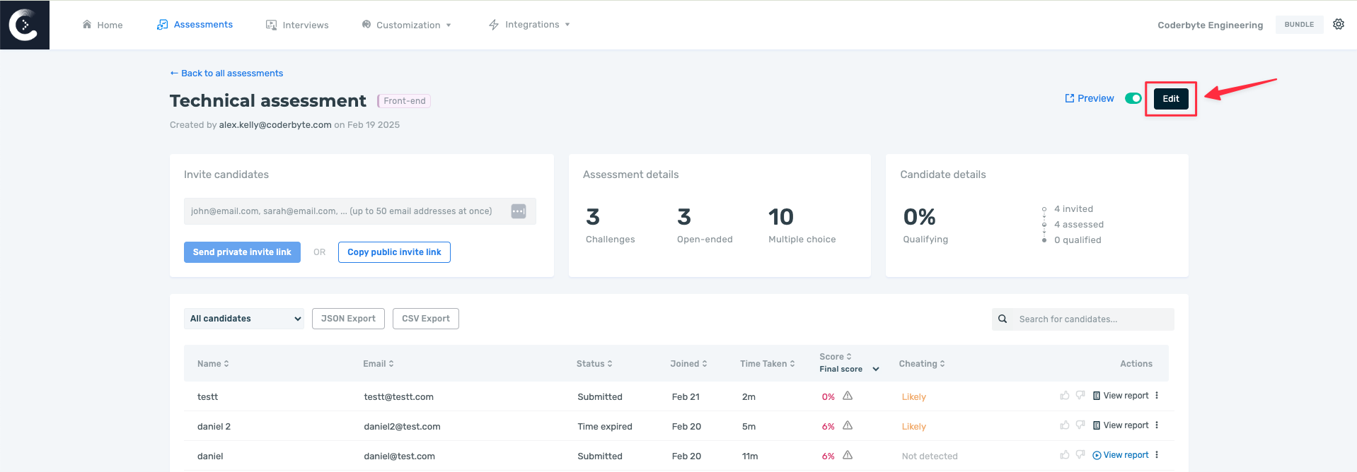 Once you create a Assessment, you can add and remove coding challenges, multiple choice, and open ended questions to it. Click Edit in the upper right of any existing assessment to modify all the settings, challenges, and questions.