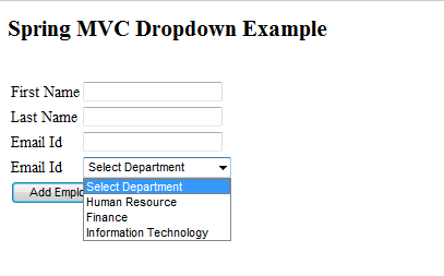 In this example, I will display a form for adding new Employee into system. This form will have a dropdown listing all departments. Application user must select one a value from dropdown before submitting the form.