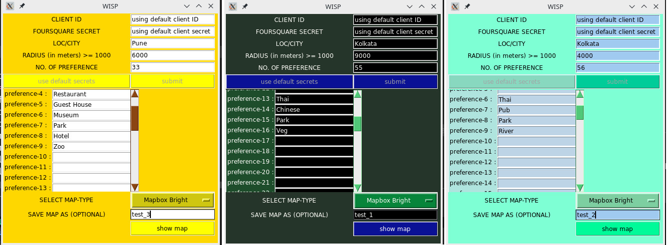 While planning a tour to Pune in India, for the first time and we don’t know the best place according to our preferences and benefits. We may prefer to stay in a restaurant which is close to Market, or we may prefer cold breeze of a river or a lake. Yet, we may also like Park in our preferences or maybe Cafe or Dominoes for those who likes Pizza or Tea. We may have some other preferences or choices. So, what can we do? We can search the Internet and then research a bit, we may find some service providers or other groups where the people know the places according to the preference of the user. If one gets too lucky, they may have somebody known there, which is of course a local person to Pune who knows nook and corner of the city. The user, who wants to go for a vacation, might call his/her friend and may tell them to visit the best place, which is affordable for staying and which has the preferences according to the choices the users want and get their job done. But, in today’s busy world nobody cares to do such research and call friend, everybody is dependent on some application to find genuinely good places based on mass reviews from lot of local people. So, we come up with an application named Wisp. It is a standalone application based on Python programming language. It eliminates the overhead of doing research of a place for finding the hot-spots according to their preferences, which uses clustering algorithm along with fetching data from a remote server and visualises it in map. We provided certain features in the application to save that map and use it for future. Since, data is the new oil, we use data from a rich community maintained Foursquare API to visualise our map. We also think that if we could promote the use of Foursquare API, more users would actually use and provide data to the API by giving reviews, comments, etc, which will in turn increase the data and content of the API.