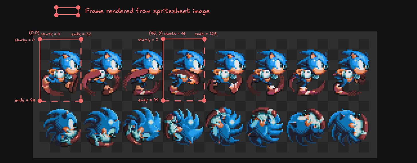 Now that I knew how to display a single frame within a wider image, I used the following logic to setup Sonic’s run animation.