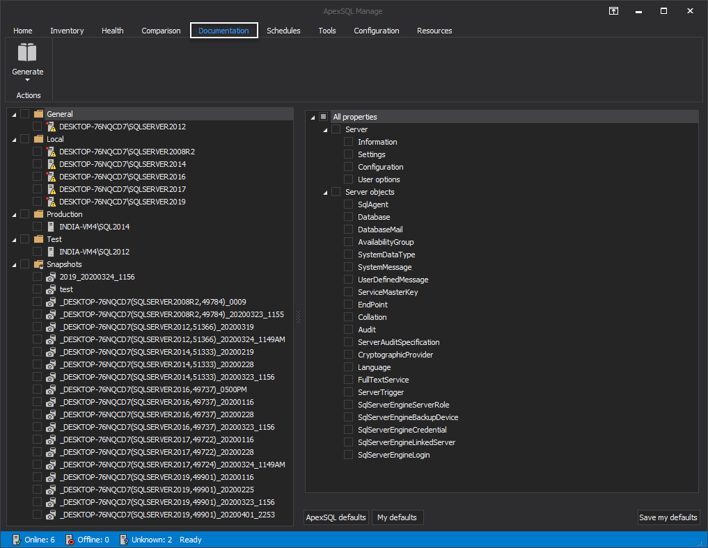 There is a neat option to save the checked SQL Server properties for later use. After checking them from the All properties section, just click Save my defaults button on the lower part of the Documentation tab. To use the saved documentation options from the All properties area for any other SQL Server or snapshot, check them in the Server panel and click the My defaults button: