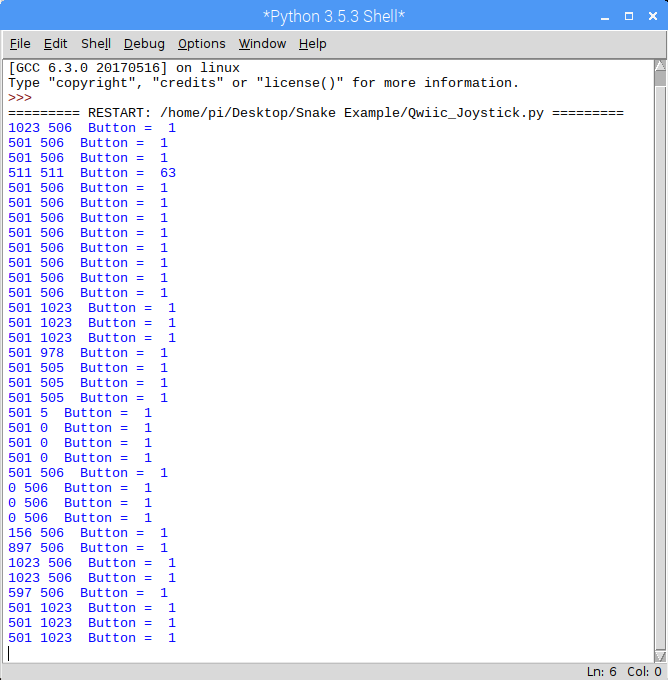 When you run the Snake Game example code, you only need to click the button to start the game. (*Shout out to Al Sweigart for his Wormy example, which was adapted to work with the Qwiic Joystick.)