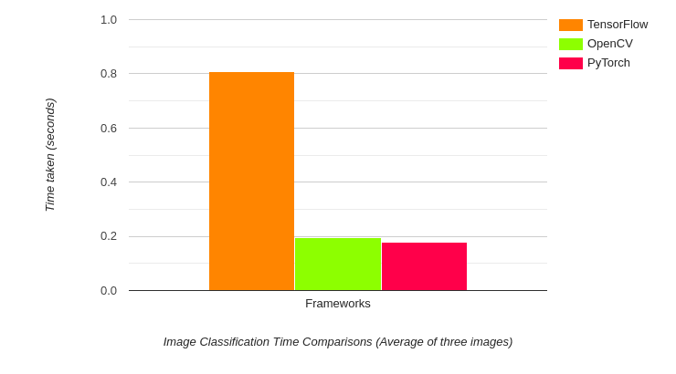 The above results are inference timing for the DenseNet121 model. Surprisingly, OpenCV is much faster than TensorFlow’s original implementations while falling behind PyTorch by a small margin. In fact, TensorFlow’s inference time is close to 1 second, whereas OpenCV takes less than 200 milliseconds.