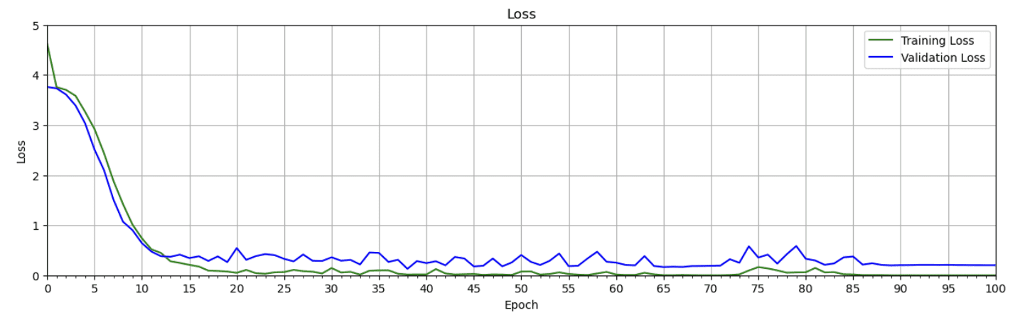2023-02-24 17:45:09.981368: I tensorflow/core/grappler/optimizers/custom_graph_optimizer_registry.cc:113] Plugin optimizer for device_type GPU is enabled. 38/38 [==============================] - ETA: 0s - loss: 4.6315 - accuracy: 0.0266 2023-03-12 14:44:08.409648: I tensorflow/core/grappler/optimizers/custom_graph_optimizer_registry.cc:113] Plugin optimizer for device_type GPU is enabled. 38/38 [==============================] - 14s 350ms/step - loss: 4.6315 - accuracy: 0.0266 - val_loss: 3.7607 - val_accuracy: 0.0233 Epoch 2/101 38/38 [==============================] - 13s 345ms/step - loss: 3.7549 - accuracy: 0.0382 - val_loss: 3.7326 - val_accuracy: 0.0446 Epoch 3/101 38/38 [==============================] - 13s 347ms/step - loss: 3.7023 - accuracy: 0.0440 - val_loss: 3.6089 - val_accuracy: 0.0930 : : : Epoch 98/101 38/38 [==============================] - 13s 340ms/step - loss: 2.1567e-05 - accuracy: 1.0000 - val_loss: 0.2036 - val_accuracy: 0.9690 Epoch 99/101 38/38 [==============================] - 13s 340ms/step - loss: 8.7136e-05 - accuracy: 1.0000 - val_loss: 0.2027 - val_accuracy: 0.9690 Epoch 100/101 38/38 [==============================] - 13s 339ms/step - loss: 7.7500e-05 - accuracy: 1.0000 - val_loss: 0.2015 - val_accuracy: 0.9690 Epoch 101/101 38/38 [==============================] - 13s 340ms/step - loss: 2.9507e-05 - accuracy: 1.0000 - val_loss: 0.2014 - val_accuracy: 0.9690
