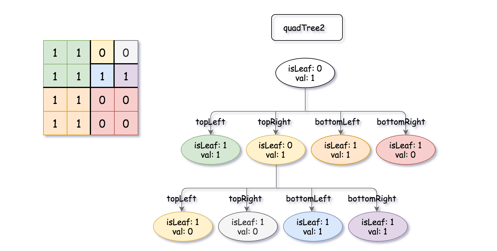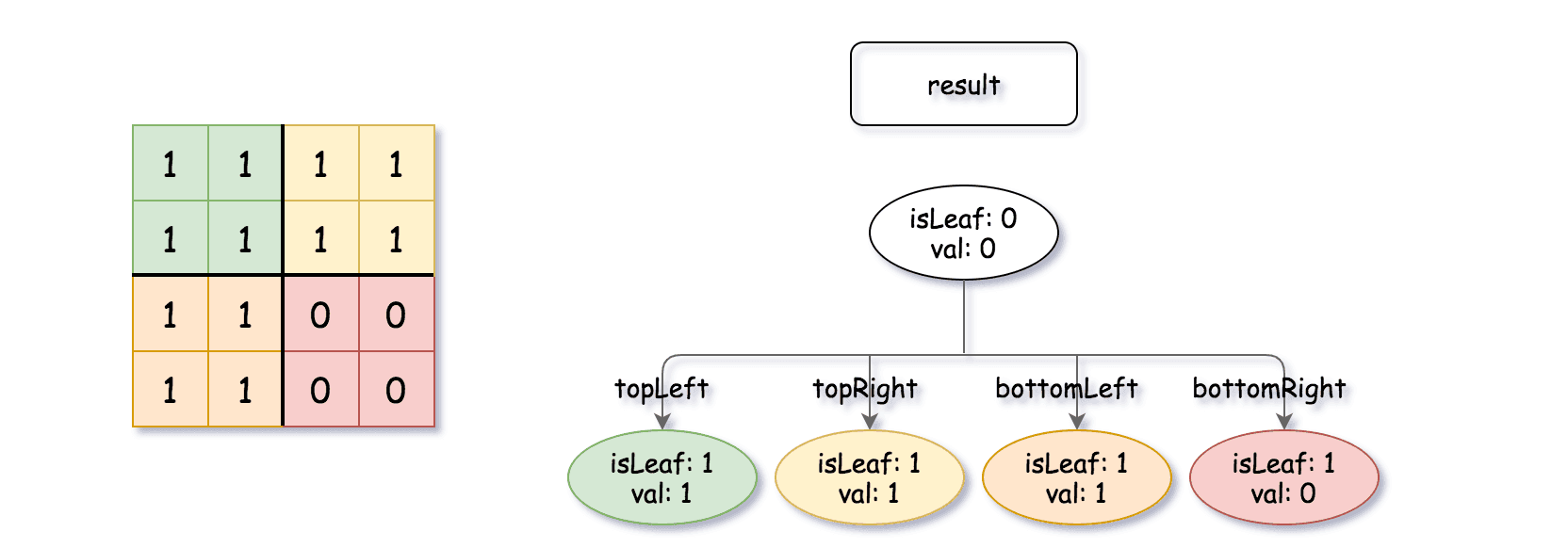 class Node { public boolean val; public boolean isLeaf; public Node topLeft; public Node topRight; public Node bottomLeft; public Node bottomRight; }