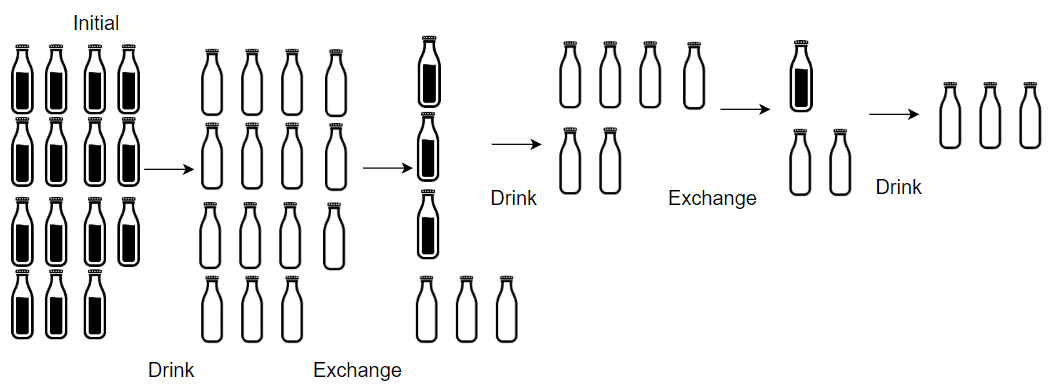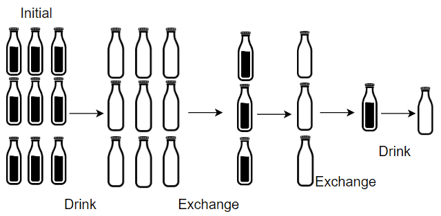 Input: numBottles = 9, numExchange = 3 Output: 13 Explanation: You can exchange 3 empty bottles to get 1 full water bottle. Number of water bottles you can drink: 9 + 3 + 1 = 13.