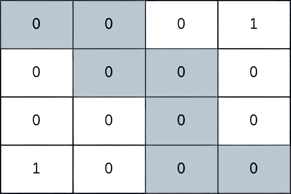 Input: grid = [[1,0,0],[0,0,0],[0,0,1]] Output: 0 Explanation: All paths from (0, 0) to (n - 1, n - 1) go through the thieves in cells (0, 0) and (n - 1, n - 1).