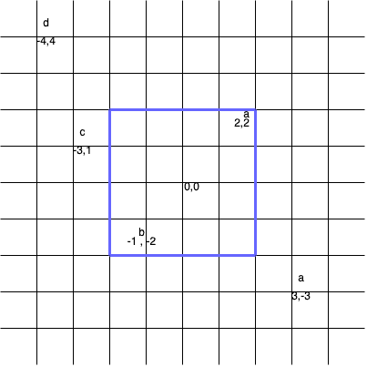 class Solution { public int maxPointsInsideSquare(int[][] points, String s) { TreeMap<Integer, List<Integer>> g = new TreeMap<>(); for (int i = 0; i < points.length; ++i) { int x = points[i][0], y = points[i][1]; int key = Math.max(Math.abs(x), Math.abs(y)); g.computeIfAbsent(key, k -> new ArrayList<>()).add(i); } boolean[] vis = new boolean[26]; int ans = 0; for (var idx : g.values()) { for (int i : idx) { int j = s.charAt(i) - 'a'; if (vis[j]) { return ans; } vis[j] = true; } ans += idx.size(); } return ans; } } -