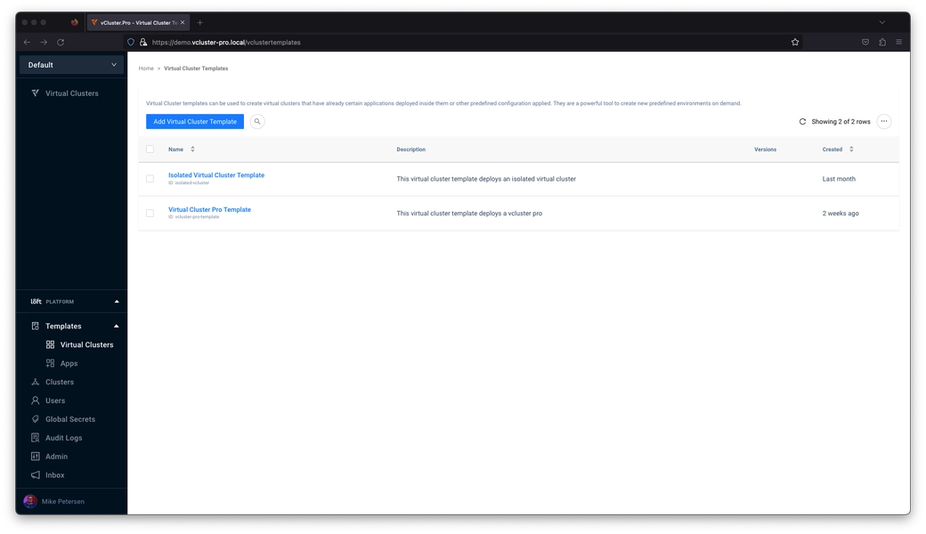 Virtual cluster templates are, as the name implies, templates that you can create, which can then be applied when creating a virtual cluster. These templates can be used to configure any virtual cluster settings that you would configure on an individual virtual cluster.