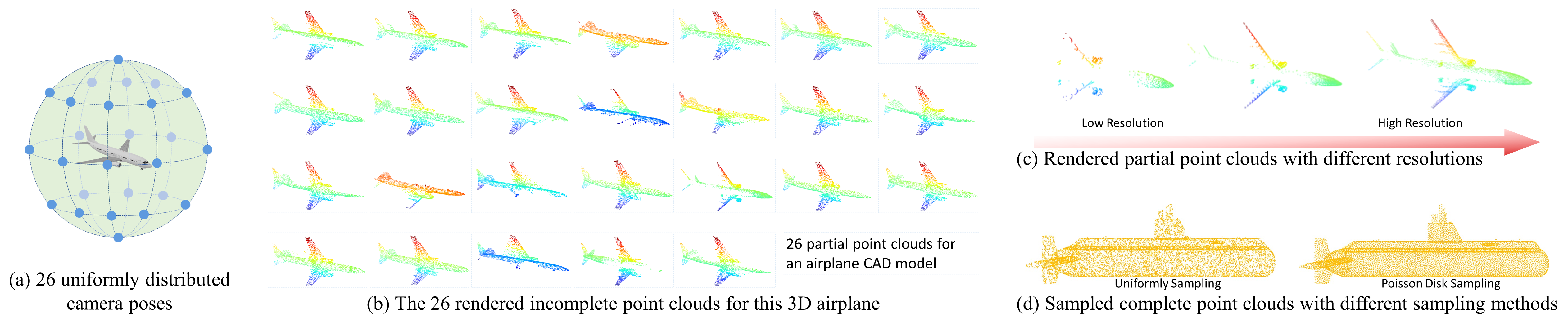 Second, MVP provides high-quality incomplete and complete ponit clouds from rich categories. We use high-resolution virtual cameras for rendering partial point clouds, and high-quality complete ponit clouds are generated by Possion Disk Sampling.