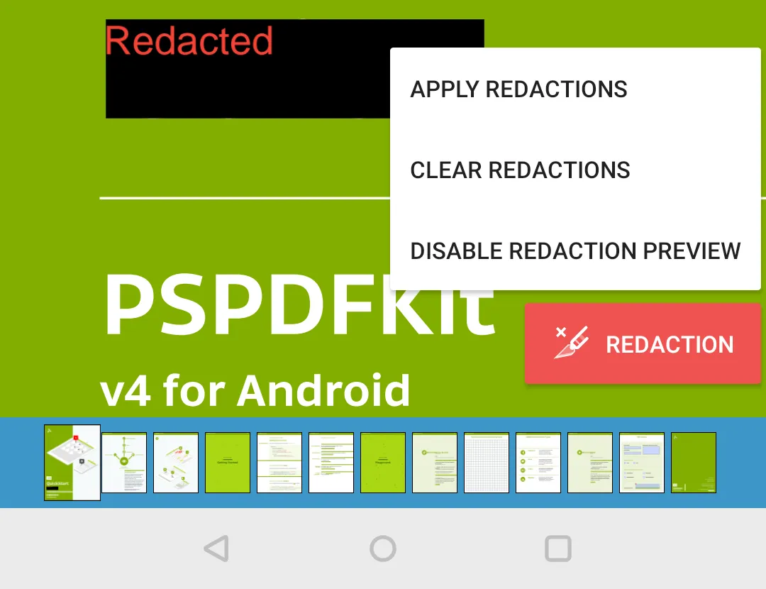 Redactions can be previewed by tapping on the floating redaction info button. When switching the preview mode on, all redaction annotations in a document will be rendered in their redacted state appearance (as opposed to the marked state that is otherwise always shown by default). This can be changed without having any content removed from the document. It’s just for previewing purposes, and the actual removal of the document content will only happen when tapping the Apply Redactions button.