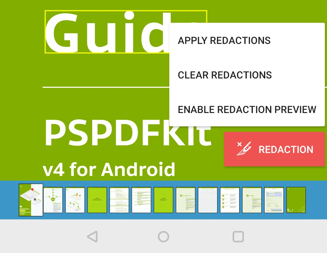 Once there are redactions in the document, a floating redaction info button is shown in the user interface view. Tapping this button reveals a UI to apply redactions in the document. Tapping the Apply Redactions button will allow you to overwrite the current document or save the redacted version to a new location and remove the content in the area of the redaction annotations irreversibly. Tapping the Clear Redactions button will remove all redaction annotations. This can be undone using the regular undo button. In the process of redacting the content, all redaction annotations are removed from the document.