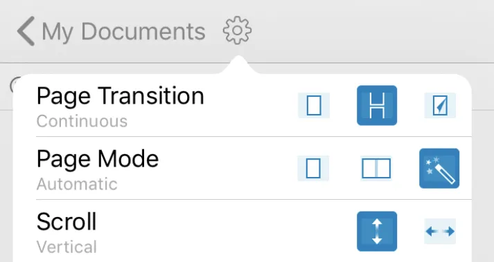 let configuration = PDFConfiguration { builder in // When the page transition is `curl`. builder.pageTransition = .curl builder.scrollDirection = .horizontal // Setting a value to the `scrollDirection` property will be ignored. It will be forced to `.horizontal`. builder.pageMode = .single // Can also be `.double` or `.automatic`.}PSPDFConfiguration *configuration = [PSPDFConfiguration configurationWithBuilder:^(PSPDFConfigurationBuilder *builder) { // When the page transition is `PSPDFPageTransitionCurl`. builder.pageTransition = PSPDFPageTransitionCurl; builder.scrollDirection = PSPDFScrollDirectionHorizontal; // Setting a value to the `scrollDirection` property will be ignored. It will be forced to `PSPDFScrollDirectionHorizontal`. builder.pageMode = PSPDFPageModeSingle; // Can also be `PSPDFPageModeDouble` or `PSPDFPageModeAutomatic`.}];Persisting the settings options with user defaults