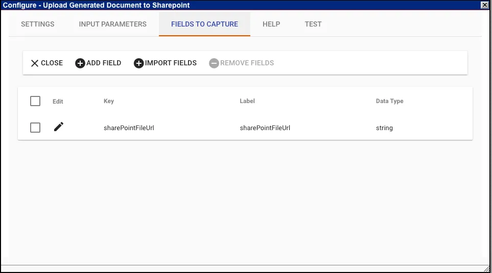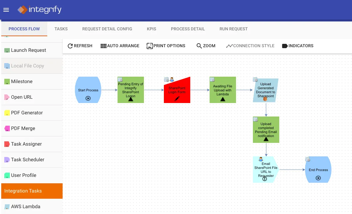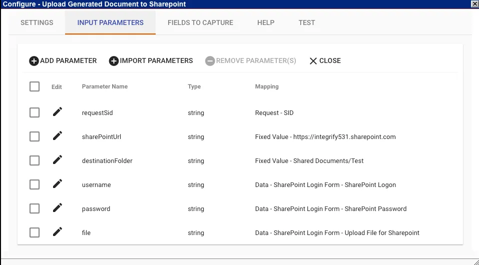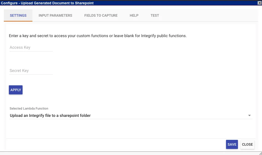 Select the function name "Upload an Integrify file to a SharePoint folder" and then click "Save."