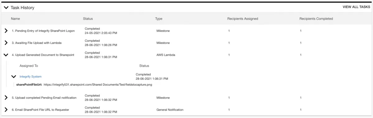 If you used the example process provided an email notification will be sent to the requester with a URL for the uploaded file in SharePoint. You can also find this value in the request details under Task History by expanding the completed Lambda task.