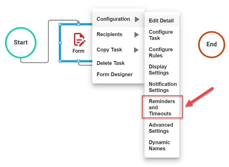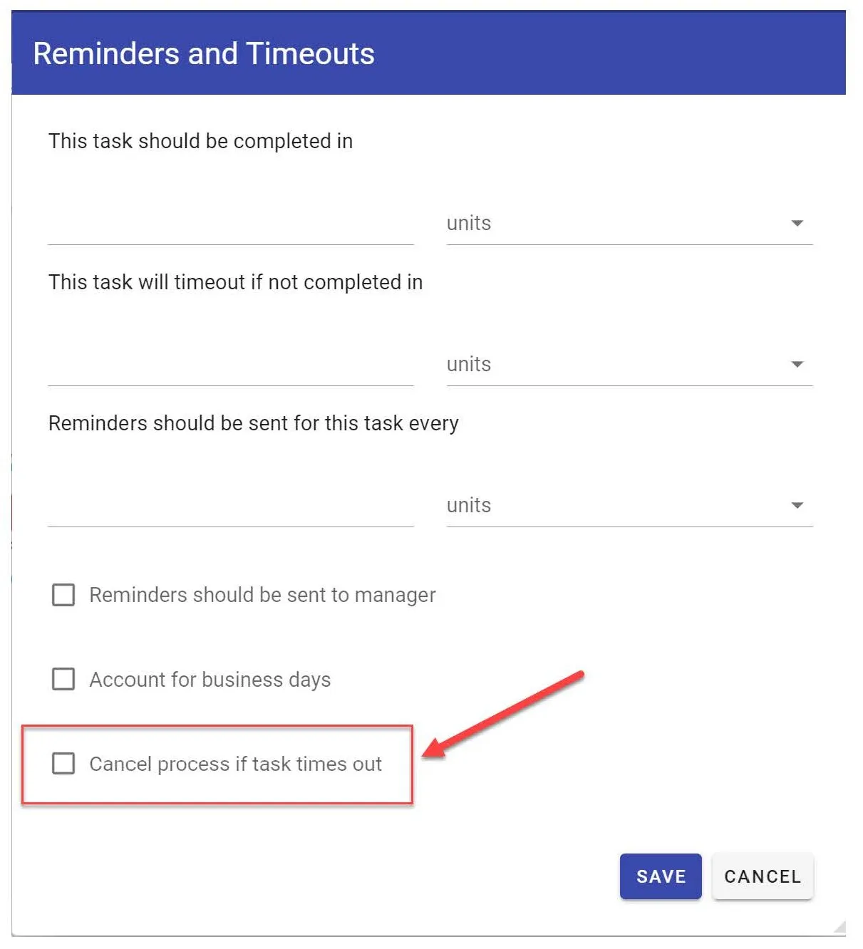 Cancel process if task times outSlide ButtonThis setting has been moved to the 'Reminders & Timeouts' dialog of the task. This will allow for the request (instance of the process) to be cancelled if the task is timed out.